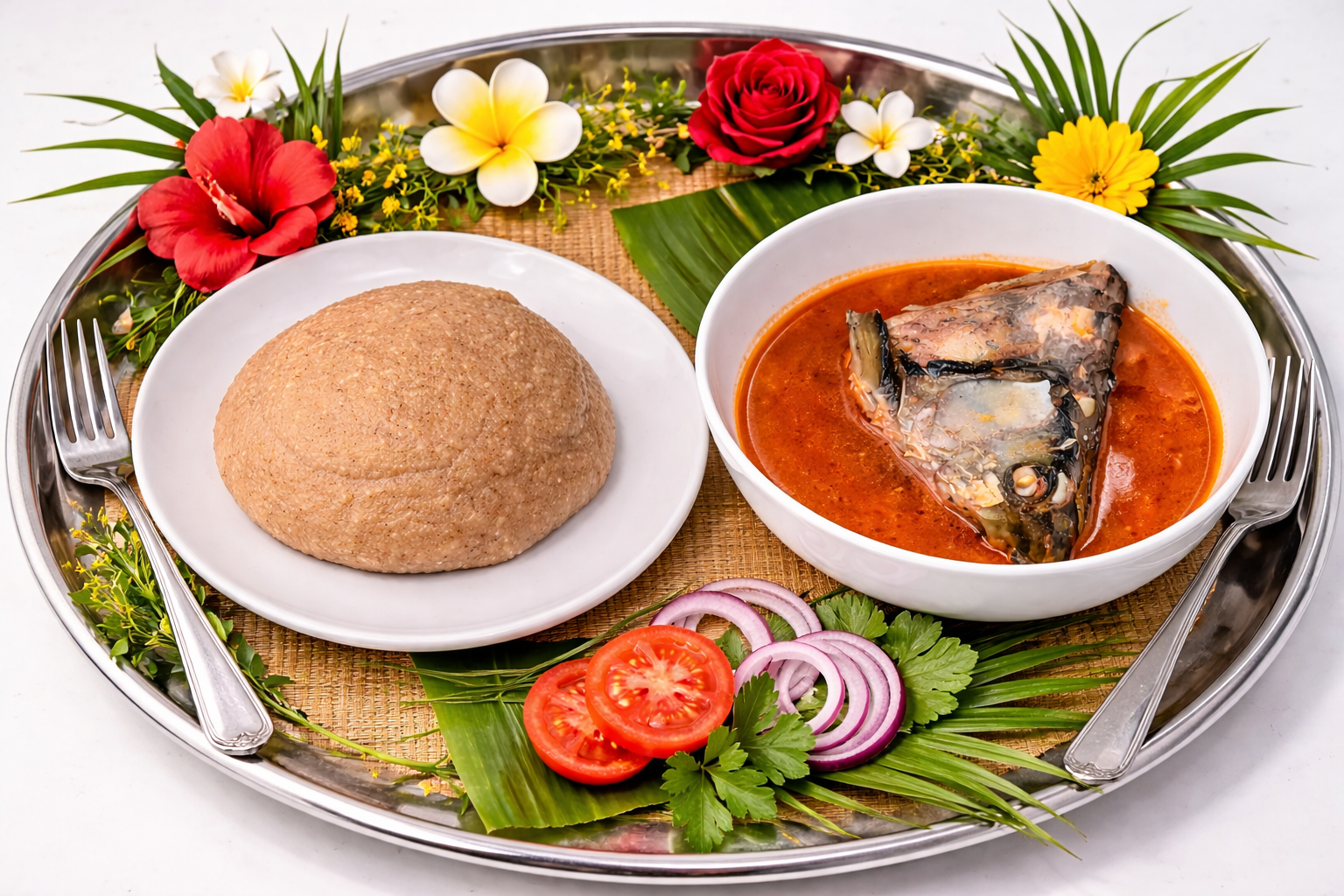 Freshly prepared smoked fish cooked in a flavorful, well-seasoned soup with a rich natural color, perfectly salted and packed in a secure, leak-proof disposable container, ready for clean and safe delivery.